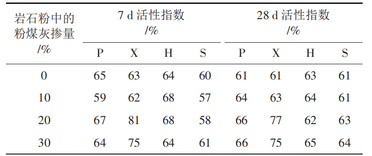 由上表可知,對(duì)于 7 d 活性指數(shù),石灰石粉在粉煤灰摻量 30%時(shí)最大,其它巖石粉在粉煤灰摻量 20%時(shí)最佳;28 d活性指數(shù),片麻巖石粉和玄武巖石粉在粉煤灰 20%摻量時(shí)最佳,花崗巖石粉在粉煤灰摻量 20%時(shí)最小,其它摻量下變化不大;齡期相同時(shí)石灰石粉的活性指數(shù)為 4 種巖石粉中最低。相同情況下石灰石粉后期活性指數(shù)比 7 d 活性指數(shù)高,片麻巖石粉組和玄武巖石粉組在 0%和 20%粉煤灰摻量下,7 d 活性指數(shù)比 28 d 高,10%粉煤灰摻量下后期活性指數(shù)更高,30%粉煤灰摻量下片麻巖石粉組后期活性指數(shù)更高,玄武巖石粉組 2 個(gè)齡期活性指數(shù)相同;花崗巖石粉組在 30%粉煤灰摻量下后期活性指數(shù)提高 1%,其他粉煤灰摻量下,7 d 活性指數(shù)比 28 d 高。