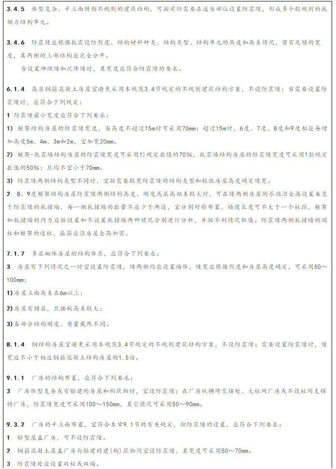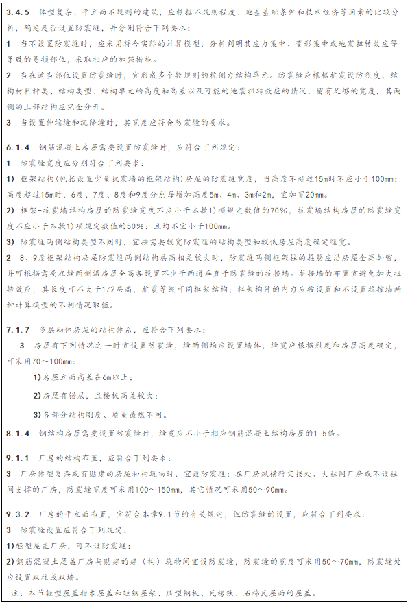 我國的10規范(《建筑抗震設計規范》GB 50011-2010)在第3.4.5條給出了防震縫設置的一般規定,同時,在第6.1.4條、7.1.7條、8.1.4條、9.1.1條和9.3.2條等處分別對鋼筋混凝土房屋、砌體結構房屋、鋼結構房屋、鋼筋混凝土廠房以及單層磚柱廠房等防震縫設置進行了規定。