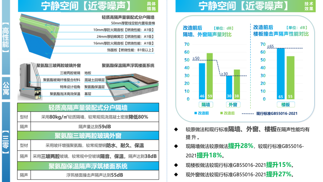 在寧靜空間·近零噪聲方面,項(xiàng)目運(yùn)用輕質(zhì)高隔聲量裝配式分戶隔墻、聚氨酯三玻兩腔玻璃外窗、聚氨酯保溫隔聲浮筑樓面系統(tǒng),實(shí)現(xiàn)近零噪聲。