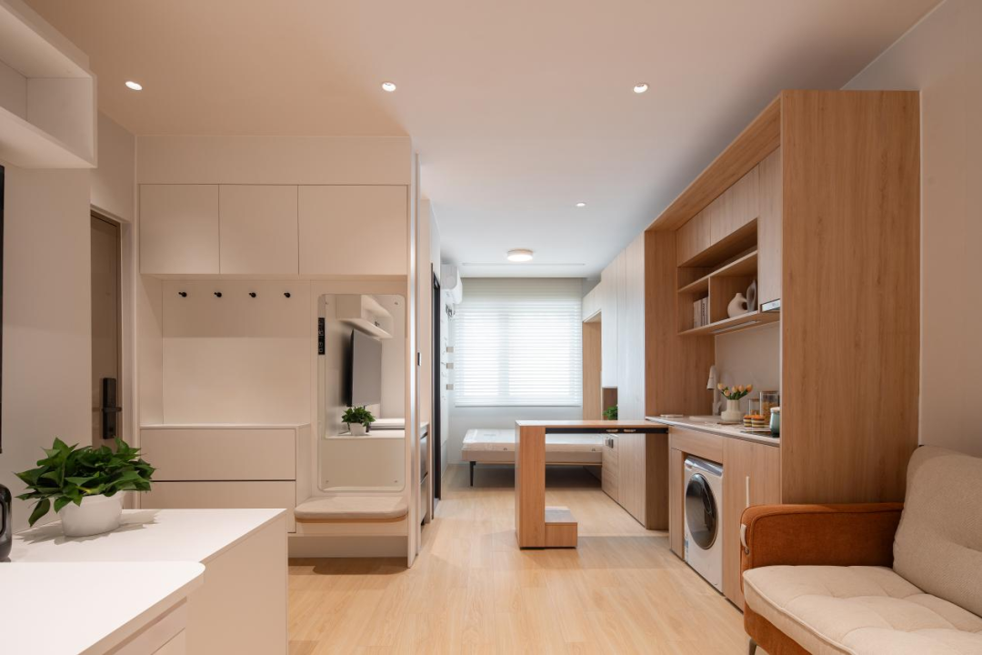 在設(shè)計(jì)理念上,該項(xiàng)目以“安全、舒適、綠色、智慧”四大體系為核心,致力于打造高品質(zhì)住房示范樣板。設(shè)計(jì)團(tuán)隊(duì)從建筑既有戶型出發(fā),精心規(guī)劃了四種戶型,以折疊空間為戶內(nèi)空間主體概念,通過可變家具實(shí)現(xiàn)靈活可變及空間功能的復(fù)合使用。每一種戶型設(shè)計(jì)都精準(zhǔn)洞察并貼心回應(yīng)了未來生活方式。