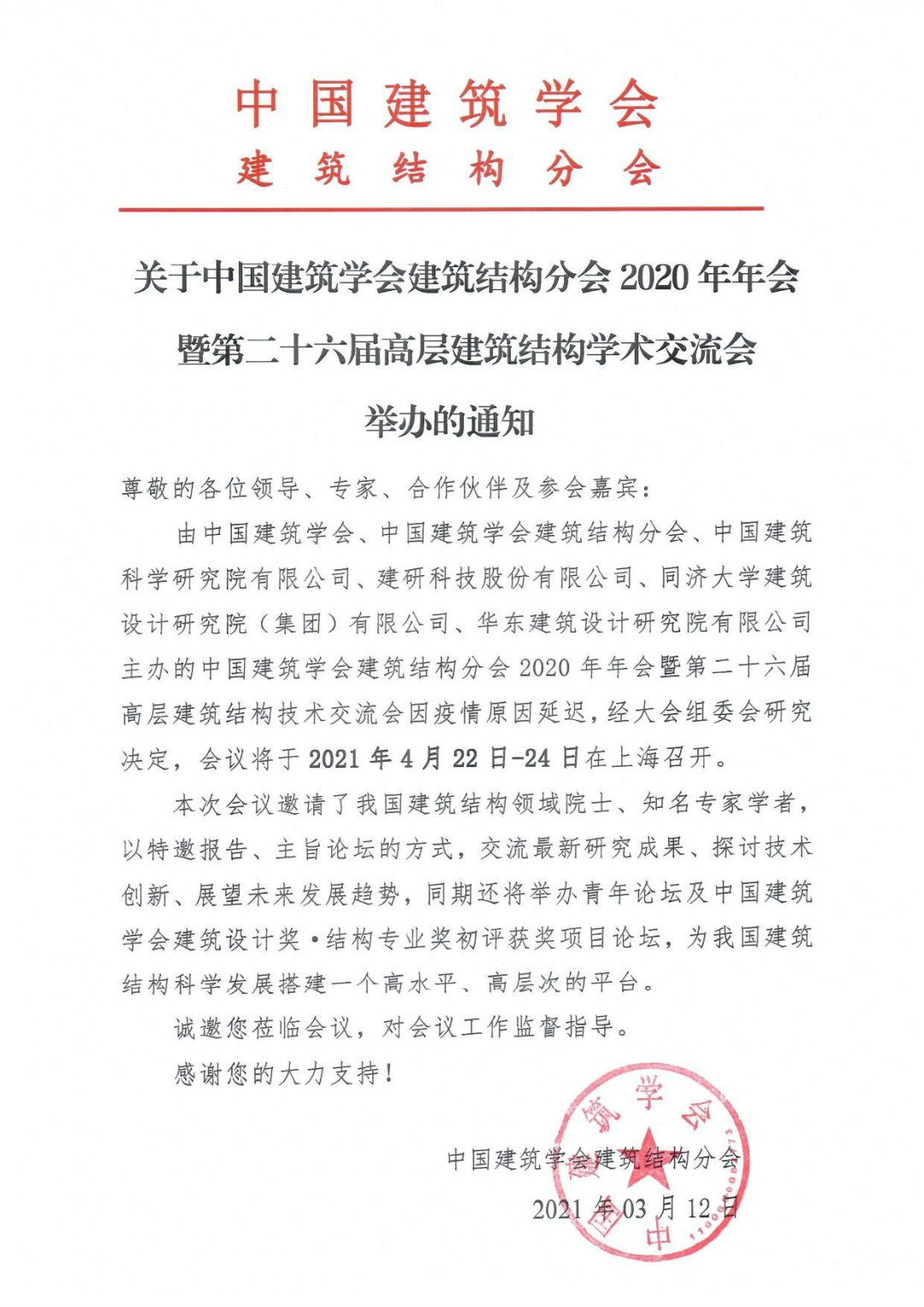 由中國建筑學會、中國建筑學會建筑結(jié)構(gòu)分會、中國建筑科學研究院有限公司、建研科技股份有限公司、同濟大學建筑設(shè)計研究院(集團)有限公司、華東建筑設(shè)計研究院有限公司主辦的中國建筑學會建筑結(jié)構(gòu)分會2020年年會暨第二十六屆高層建筑結(jié)構(gòu)技術(shù)交流會因疫情原因延遲,經(jīng)大會組委會研究決定,會議將于2021年4月22日-24日在上海召開。