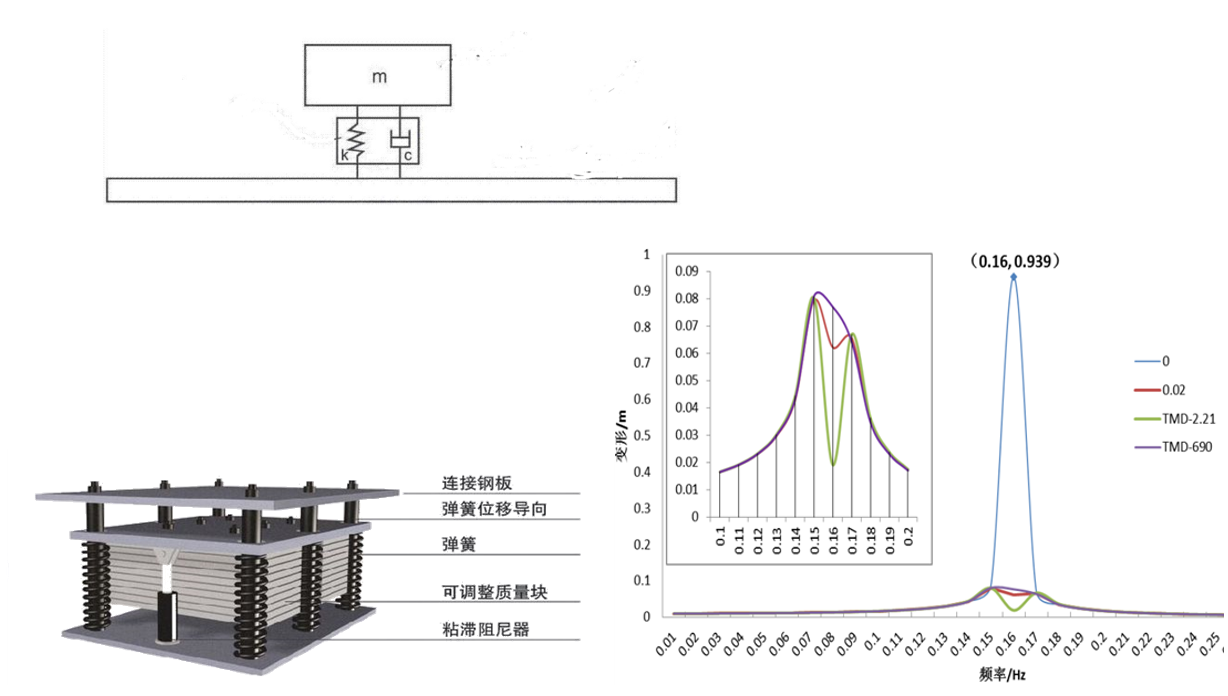 TMD減振方法是一種控制結構振動響應的減振措施。通過設置一個附加的單自由度減振體系,將原結構的振動能量吸收到減振體系。附加振動體系中的阻尼器耗能,最終消耗原結構的振動能量,大幅減小原結構的振動反應,達到舒適度要求。