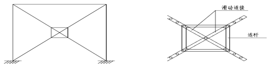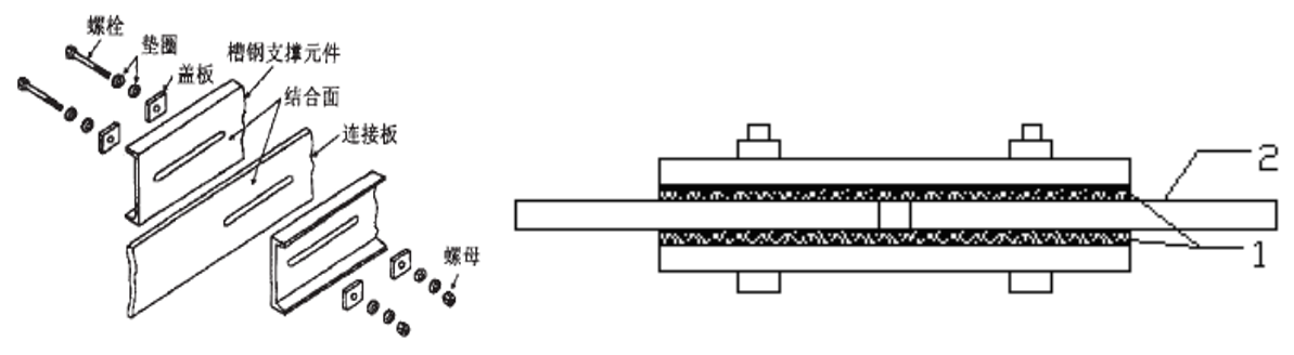 普通摩擦消能器的核心部件如圖3所示。是通過開有狹長槽孔的中間鋼板相對于上下兩塊銅墊板的摩擦運動而耗能,調(diào)整螺栓的緊固力可改變滑動摩擦力的大小。滑動摩擦力與螺栓的緊固力成正比,另外,鋼與銅接觸面之間的最大靜摩擦力與滑動摩擦力差別小,滑動摩擦力的衰減也不大,保證摩擦耗能系統(tǒng)工作的穩(wěn)定性。