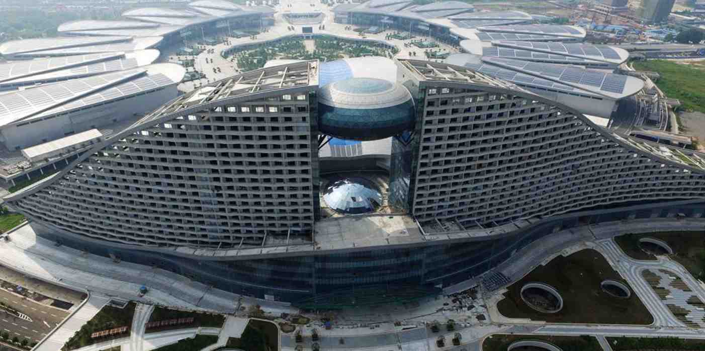 星空會所橢球鋼結(jié)構(gòu)位于武漢國博洲際酒店的頂部18層~20層的中間連體部位,外觀形式為橢圓球,橢圓球內(nèi)部由兩層鋼桁架結(jié)構(gòu)組成,外表為單層空間網(wǎng)格結(jié)構(gòu),結(jié)構(gòu)總重約1350t。結(jié)構(gòu)內(nèi)部高度21.4m,頂部標(biāo)高約97m。由于橢圓球鋼結(jié)構(gòu)為非對稱且節(jié)點(diǎn)復(fù)雜、拼裝場地受限制,同時提升高度大、空中對接難度更大,因此施工難度非常大。為了達(dá)到同步提升對結(jié)構(gòu)平衡和同步控制的要求,本工程采用了我司研發(fā)的基于伺服技術(shù)和PLC控制系統(tǒng)的大型結(jié)構(gòu)整體同步移位系統(tǒng)。