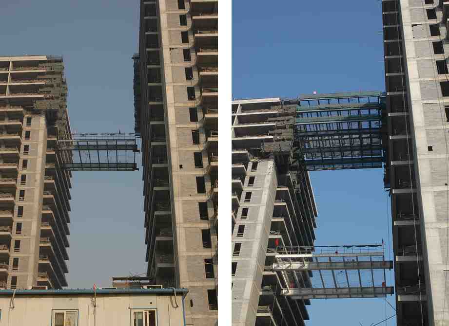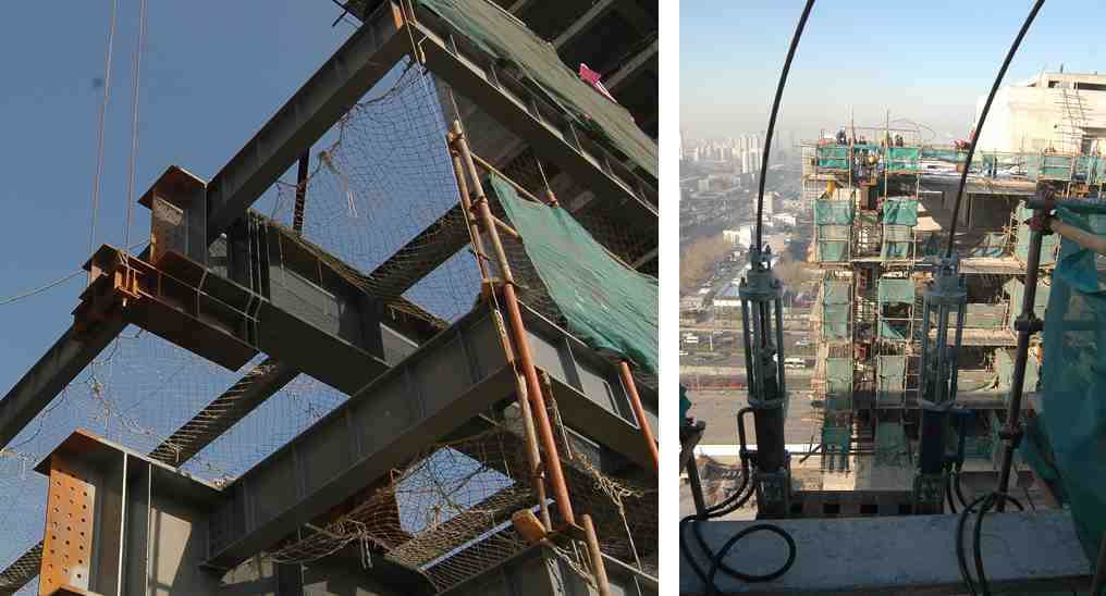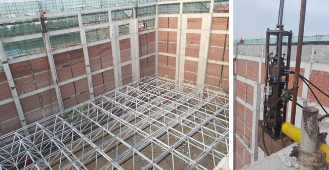北京科技大學(xué)鋼結(jié)構(gòu)連廊共分四層,跨度為25.2m。現(xiàn)場若采用高空拼裝,則需搭設(shè)近80m高的腳手架,經(jīng)濟(jì)成本過高;因此采用液壓千斤頂整體提升工藝完成連廊鋼結(jié)構(gòu)施工。實(shí)施時,在標(biāo)高12.5m(3層)處將各層連廊鋼結(jié)構(gòu)加工完成,連廊兩端設(shè)置懸臂梁牛腿,之后通過設(shè)置在懸臂牛腿上的千斤頂將連廊鋼結(jié)構(gòu)整體提升就位。