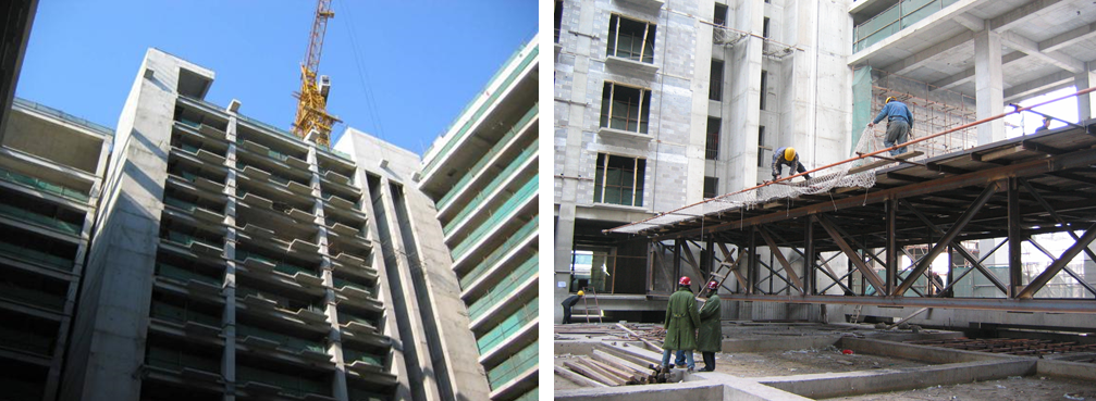 超輕弧形鋁板幕墻系統(tǒng)提升。具有提升高度高(190m)、帶維護(hù)結(jié)構(gòu)重量極輕對風(fēng)極度敏感、周邊邊界復(fù)雜、局部提升后仍需滑移就位等特點(diǎn)。采用“豎向張緊拉索+水平纜風(fēng)”作為提升抗側(cè)體系,部分靠近塔樓側(cè)幕墻單元采用“提升+高空滑移就位”的安裝方案實(shí)現(xiàn)幕墻系統(tǒng)的高效安裝。