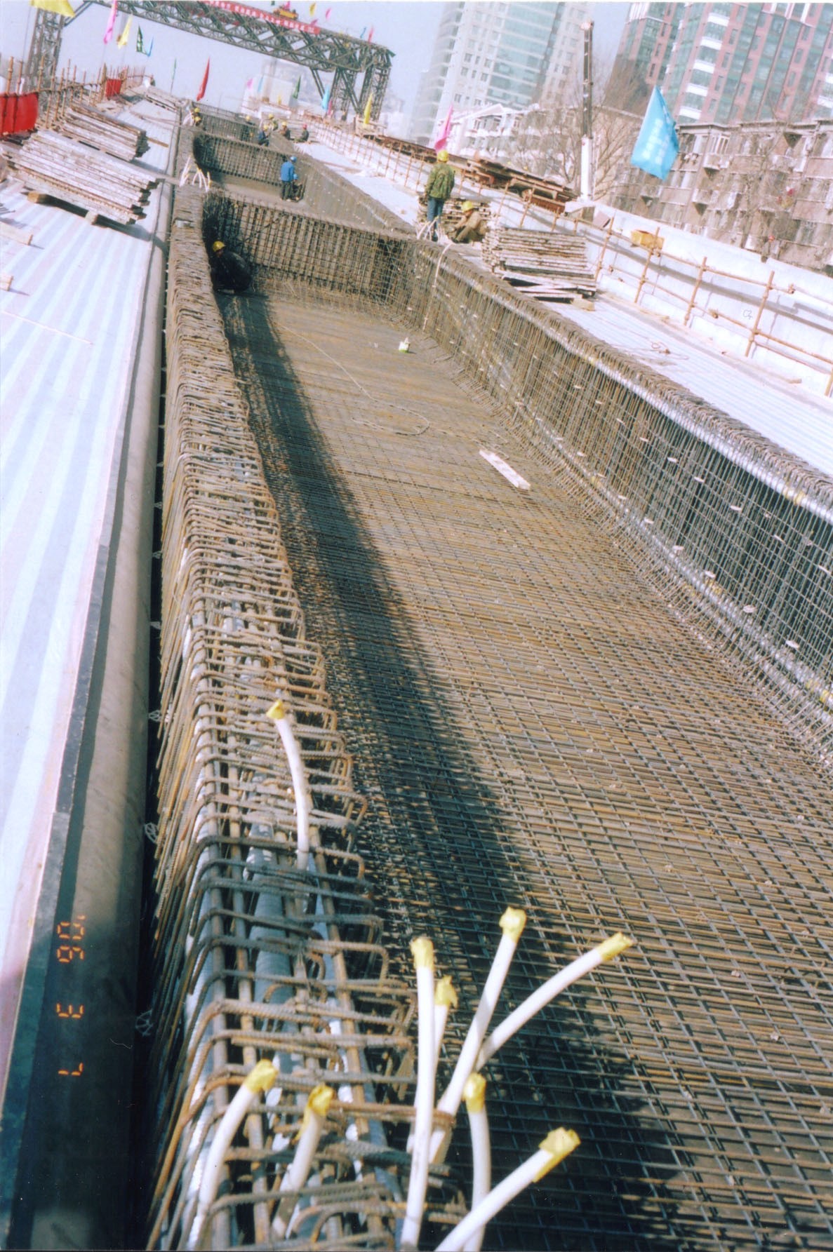預應力施工。橋最長819m,跨度最大72m,最大束長147m,采用大噸位群錨張拉、塑料波紋管、真空灌漿等技術。